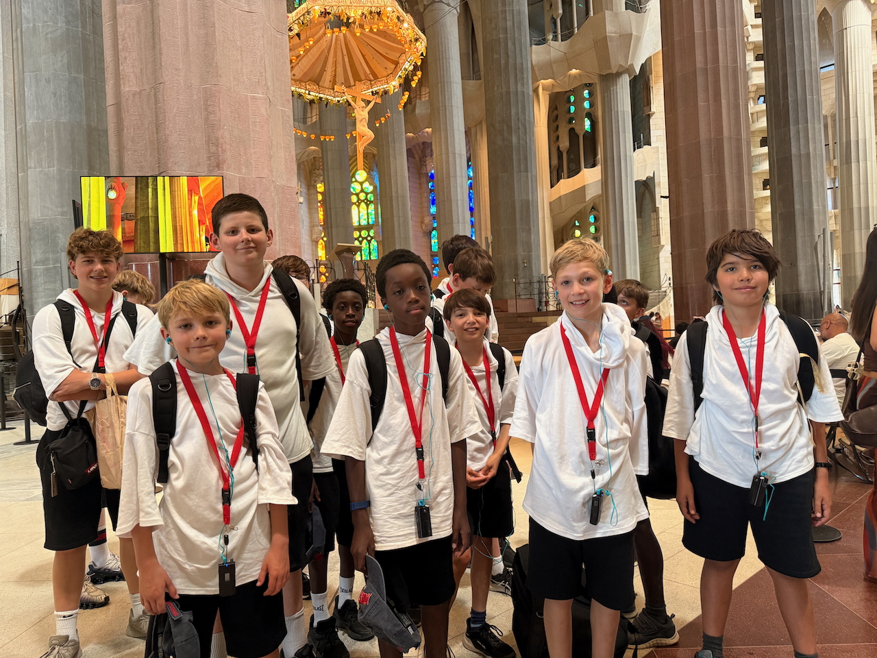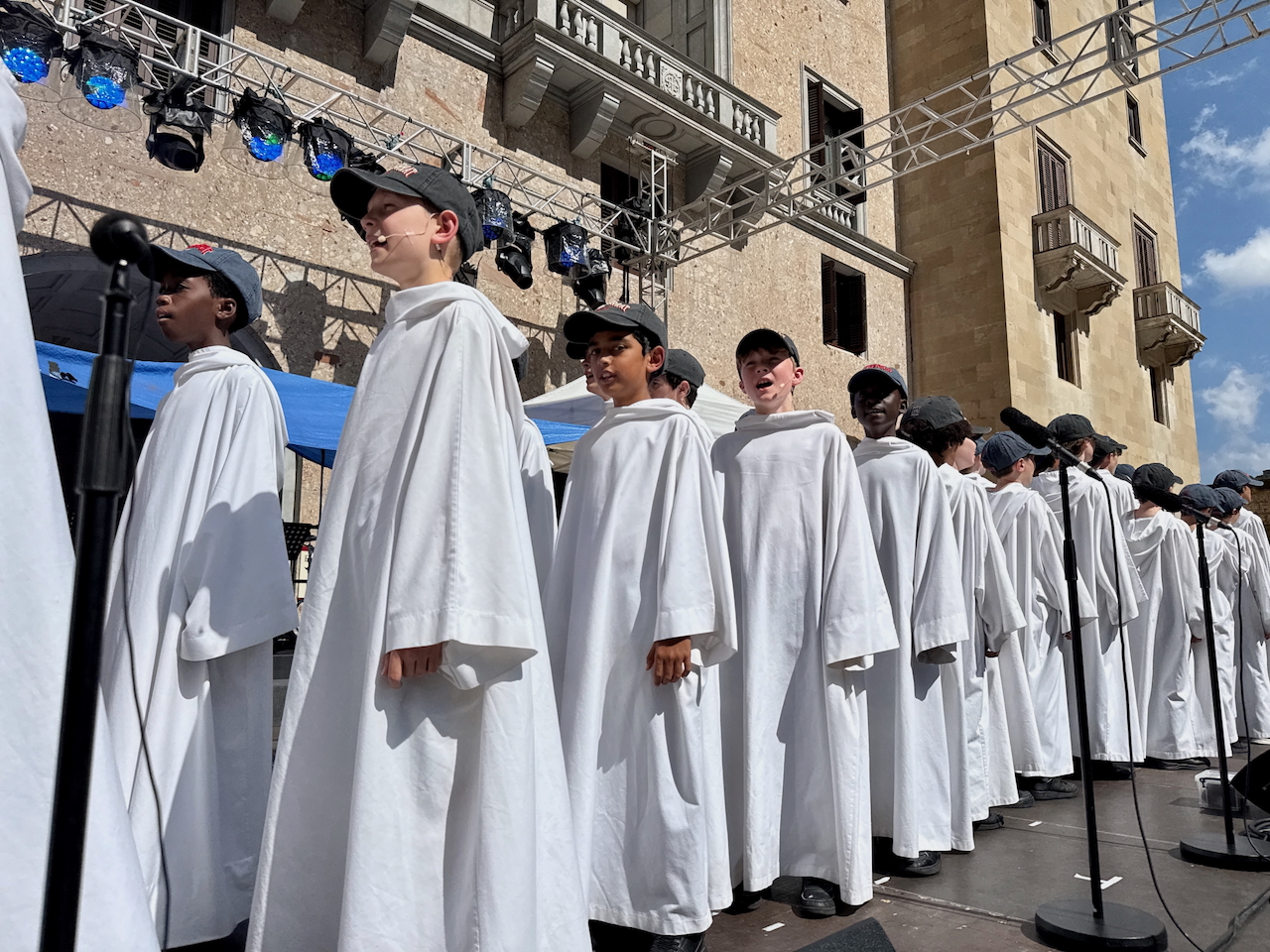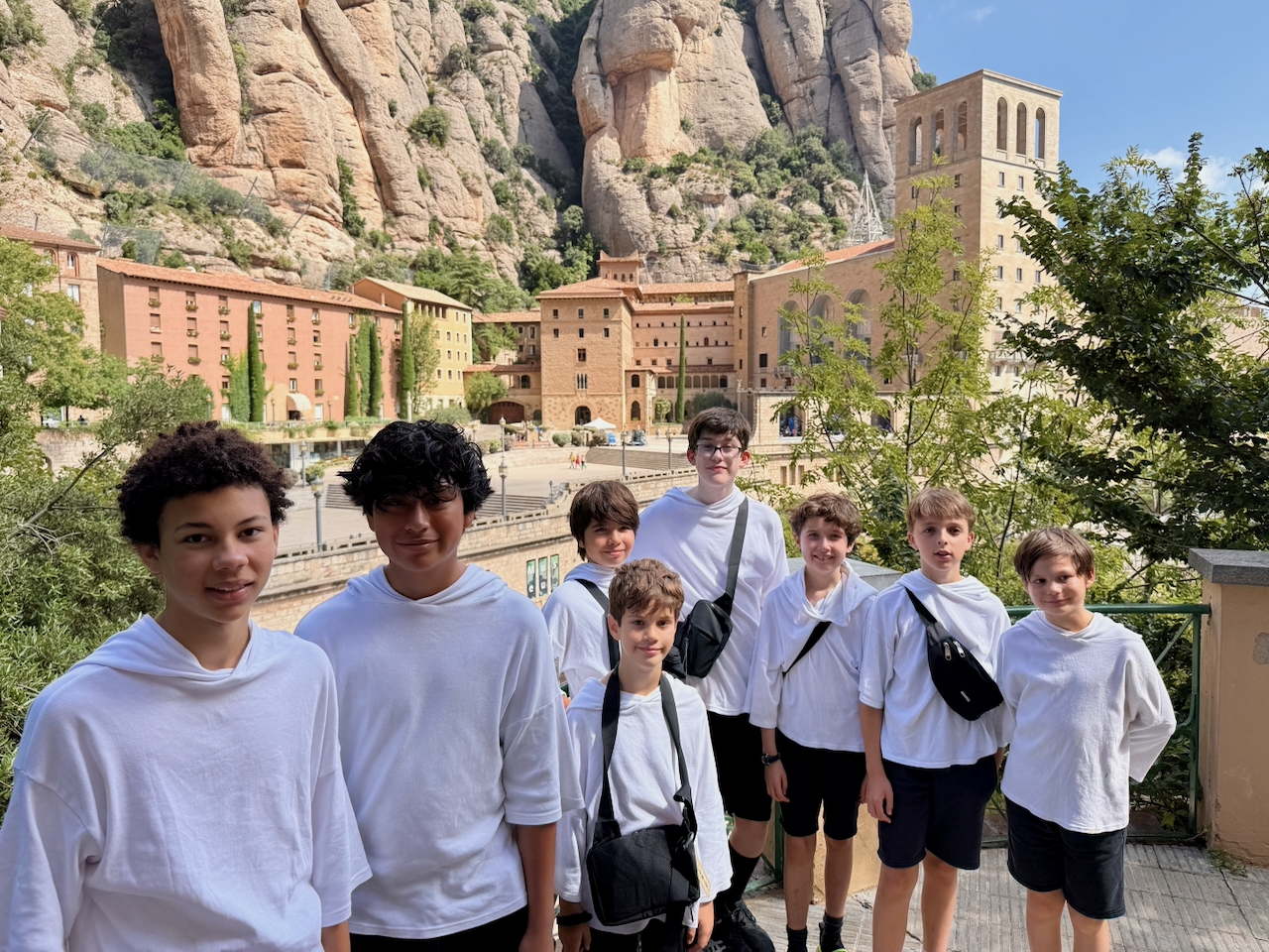 Later, when we were well-rested, we changed into our Sunday uniform, took our robes from the cupboards and walked to Montserrat Abbey. There we changed into our robes and put on our Montserrat caps, kindly given to us that morning by the abbot. Unfortunately we couldn’t wear the caps the way we really wanted to – with the brims at the back like American rappers! I guess that wouldn’t help keep the sun out of our eyes. The rehearsal went smoothly and though it was warm there was always a breeze and it fanned our robes in a nice way.